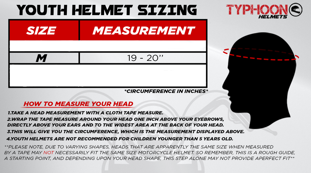 DOT approved off road helmet with an aerodynamic and modern shell design. Typhoon KYB07 youth helmets are designed with true youth sized shells for a slimmer profile and lighter helmet. The ventilation system allows for airflow throughout the interior of the helmet, perfect for warmer conditions. A quality breathable mesh lined padded liner and medium-soft density cheek pads help to keep the helmet securely in place while accommodating a variety of head shapes. Easily remove the machine washable padded liner as needed.